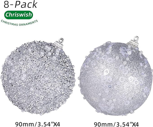 8CT Christmas Ball Ornaments, Silver Christmas Ball Decorations Shatterproof Plastic Hanging Pearl Balls for Holiday Party(90mm/3.54")