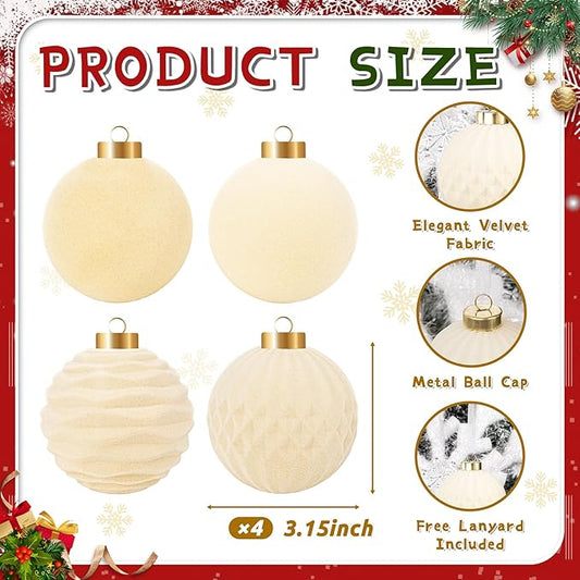 4PCS White Velvet Christmas Ornaments Set – 6 Inch Large Flocked Shatterproof Baubles for Xmas Tree Decoration, Hanging Ornaments for Holiday & Home Décor (Ivory White, 6 Inch / 15 cm)