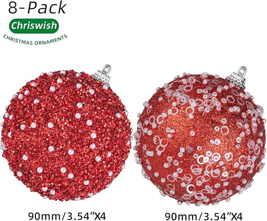 8CT Christmas Ball Ornaments, Red Christmas Ball Decorations Shatterproof Plastic Hanging Pearl Balls for Holiday Party(90mm/3.54")