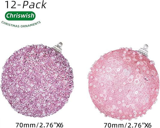12CT Christmas Ball Ornaments, Pink Christmas Ball Decorations Shatterproof Plastic Hanging Pearl Balls for Holiday Party(70mm/2.76")