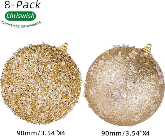 8CT Christmas Ball Ornaments, Gold Christmas Ball Decorations Shatterproof Plastic Hanging Pearl Balls for Holiday Party(90mm/3.54")