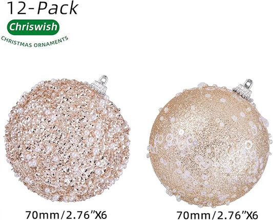 12CT Christmas Ball Ornaments, Champagne Christmas Ball Decorations Shatterproof Plastic Hanging Pearl Balls for Holiday Party(70mm/2.76")