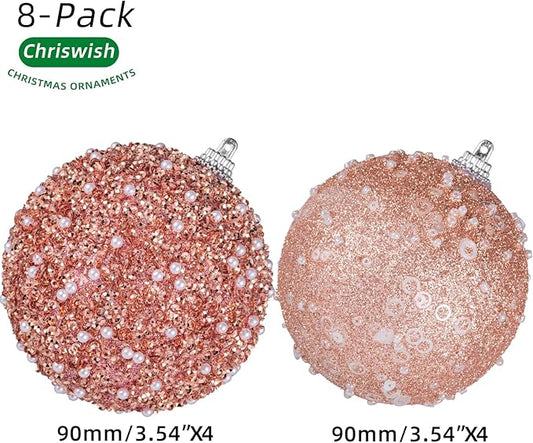 8CT Christmas Ball Ornaments, Rose Gold Christmas Ball Decorations Shatterproof Plastic Hanging Pearl Balls for Holiday Party(90mm/3.54")