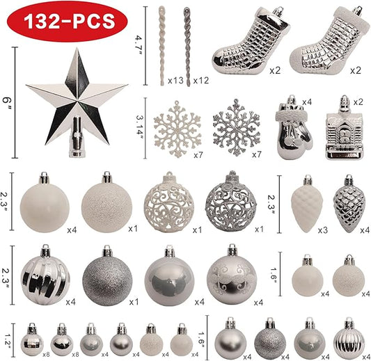 Christmas Tree Ornament Set - 132pcs Silver Ball Decoration, Shatterproof Hanging Ornaments, Large and Small Assortment for Holiday Party Decor