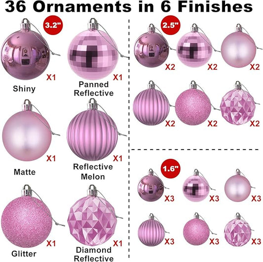 Bubblegun Pink Christmas Ornaments - Christmas Tree Decorations Shatterproof Hanging Balls for Birthday Wedding Holiday Decor Set of 36pcs, Multi-Sizes(1.6",2.5",3.2")