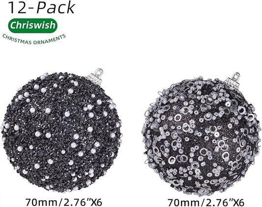 12CT Christmas Ball Ornaments, Black Christmas Ball Decorations Shatterproof Plastic Hanging Pearl Balls for Holiday Party(70mm/2.76")