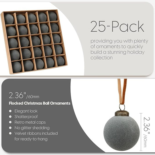 Sea Team 25-Pack Flocked Velvet Christmas Tree Ball Ornaments Set, Hanging Velour Baubles, Shatterproof Plastic Decorations for Xmas Tree, Wreath, Garland, 60mm/2.36 Inches, Gray
