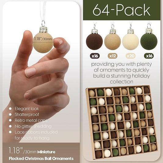 Sea Team 64-Pack Miniature Flocked Velvet Christmas Tree Ball Ornaments Set, Hanging Velour Baubles, Shatterproof Plastic Decorations for Xmas Tree, Wreath, Garland, 30mm/1.18 Inches, Prairie Fall