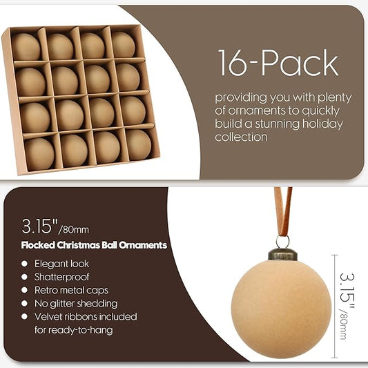 Sea Team 16-Pack Flocked Velvet Christmas Tree Ball Ornaments Set, Hanging Velour Baubles, Shatterproof Plastic Decorations for Xmas Tree, Wreath, Garland, 80mm/3.15 Inches, Beige