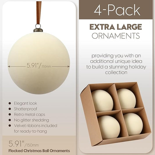 Sea Team 4-Pack Large Flocked Velvet Christmas Tree Ball Ornaments Set, Hanging Velour Baubles, Shatterproof Plastic Decorations for Xmas Tree, Wreath, Garland, 150mm/5.91 Inches, Cream