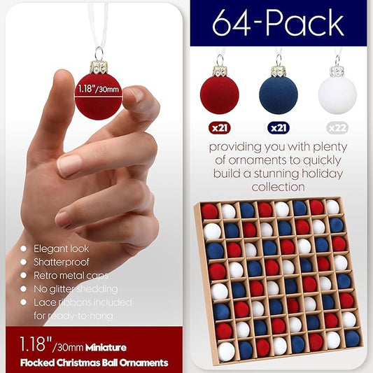 Sea Team 64-Pack Miniature Flocked Velvet Christmas Tree Ball Ornaments Set, Hanging Velour Baubles, Shatterproof Plastic Decorations for Xmas Tree, Wreath, Garland, 30mm/1.18 Inches, US Flag