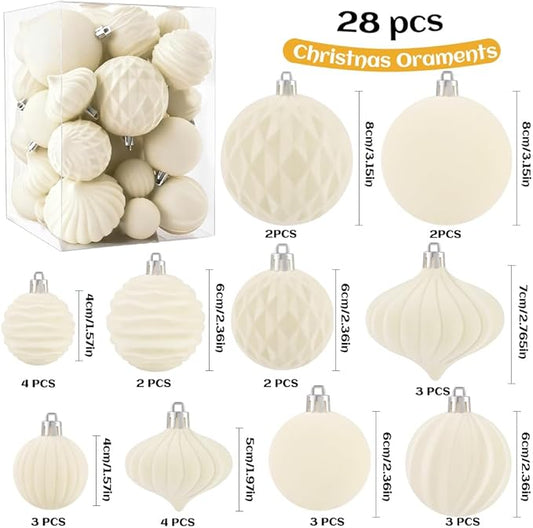 28PCS Velvet Christmas Balls Ornaments, Flocked Shatterproof Beige Cream Xmas Tree Hanging Decoration Plastic Ball Set Bulk Ornament for Winter Trees Holiday Party Home Wreath Decor