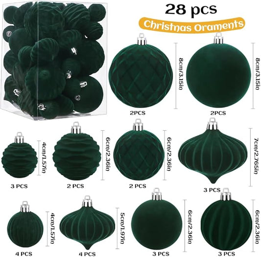 28PCS Velvet Christmas Balls Ornaments, Flocked Shatterproof Dark Green Xmas Tree Hanging Decoration Plastic Ball Set Bulk Ornament for Winter Trees Holiday Party Home Wreath Decor