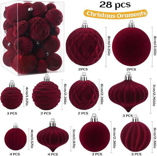 28PCS Velvet Christmas Balls Ornaments, Flocked Shatterproof Burgundy Xmas Tree Hanging Decoration Plastic Ball Set Bulk Ornament for Winter Trees Holiday Party Home Wreath Decor