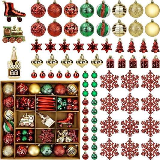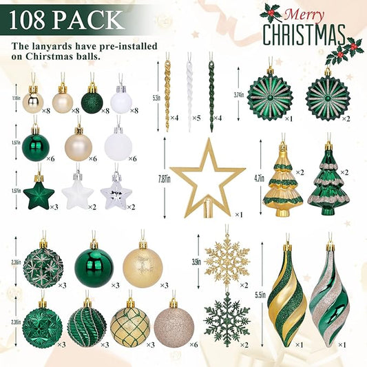 108 Pcs Christmas Ball Ornaments Set, Green and Gold Shatterproof Hand-Painted Hanging Bulbs Decoration for Xmas Tree, Wreath, Garland, Home Holiday Decor