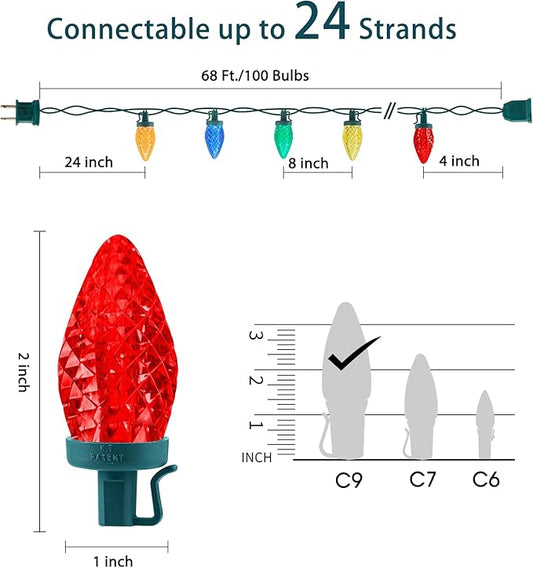 C9 LED Christmas Lights Outdoor, 68 Feet 100 LED Strawberry String Lights with 100 Spring Clamps, Waterproof Commercial Grade Extendable for Outside Roofline Patio Home Xmas Decoration, Multicolor