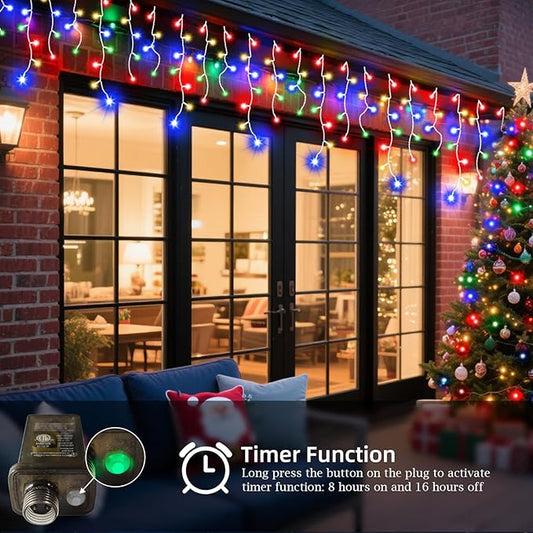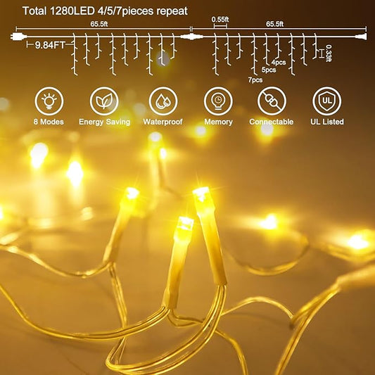 1296 LED Outdoor Christmas Lights with 288 Drops, 131FT ChristmasLights with 8 Modes Timer, Christmas Twinkly Lights IP44 Waterproof for Eaves Yard Room Holiday Wedding Party Decor(Cool White)