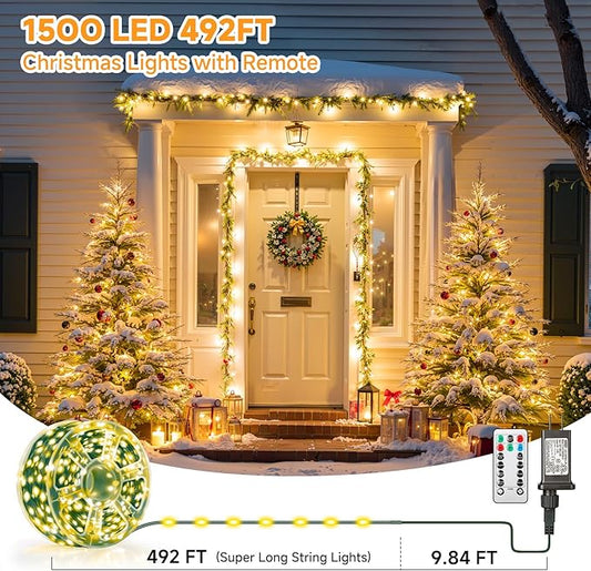 Mlambert 1500 LED Christmas Lights 492FT, Outdoor Waterproof Dimmable Fairy Lights with Remote, 8 Modes Indoor Lighting for Holiday Décor, Warm White