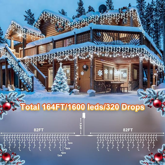KNONEW 164FT 1600 LED Christmas Lights Outdoor Decoration White Timer 8Modes Hanging Fairy String Lights with 320 Drops, Plug in Waterproof Indoor Decor for Holiday Wedding Party Window Garden