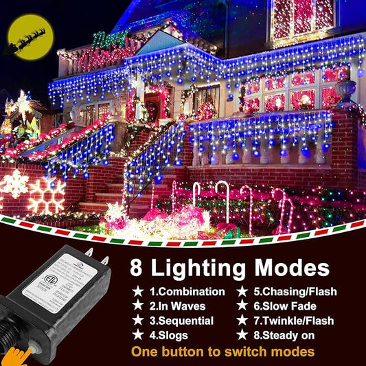 1332 LED 132ft Christmas Lights with 296 Drops, 12 Lighting Modes Blue & White Christmas Decoration Twinkling Lights Dimmable, Timer Outdoor Waterproof Fairy Lights for Indoor Garden House Eaves Roof