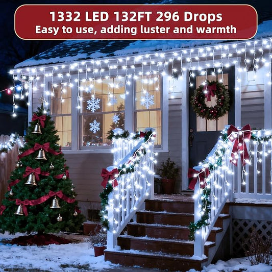 1332 LED 132ft Christmas Lights with 296 Drops, 12 Lighting Modes Cool White Christmas Decoration Twinkling Lights Dimmable, Timer Outdoor Waterproof Fairy Lights for Indoor Garden House Eaves Roof