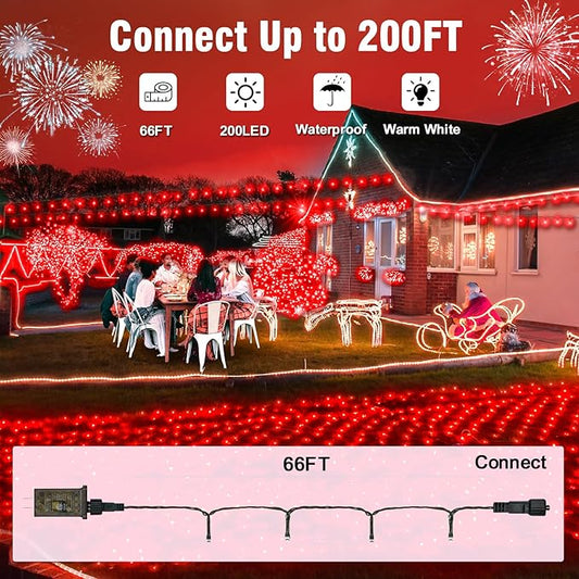 Nisocy 200 LED Red String Lights with Green Wire, Waterproof Christmas Tree Fairy Lights with 8 Modes, Indoor Outdoor Decorative Lighting for Holiday, Party, Garden, Patio(66FT)