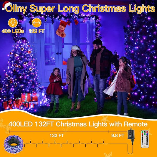 Ollny Halloween Lights 400LED 132FT, Remote Plug-in Blue & Purple Christmas Tree Lights with Timer and 8 Modes, Waterproof Outdoor/Indoor Decorations