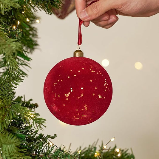 DN DECONATION 4PCS Christmas Ball Ornaments, Shatterproof Red Balls Ornaments for Christmas Tree, 4โ Velvet Plastic Decorations with Ribbons, Farmhouse Holiday Decor Xmas Gifts Winter