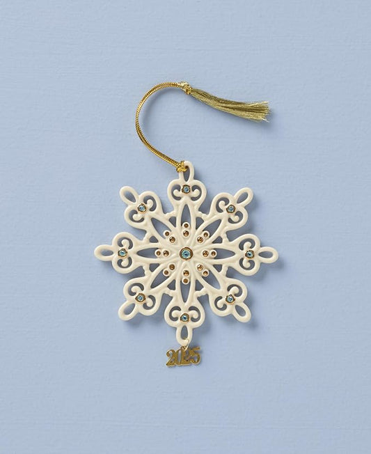Lenox Ornament, 2025 Gemmed Snowflake Ornament, Porcelain with Gold Accents and Blue Gemstones, Christmas Tree Decorations, Christmas Decoration, Gold Cord for Hanging Included (Cream, 1 Piece)