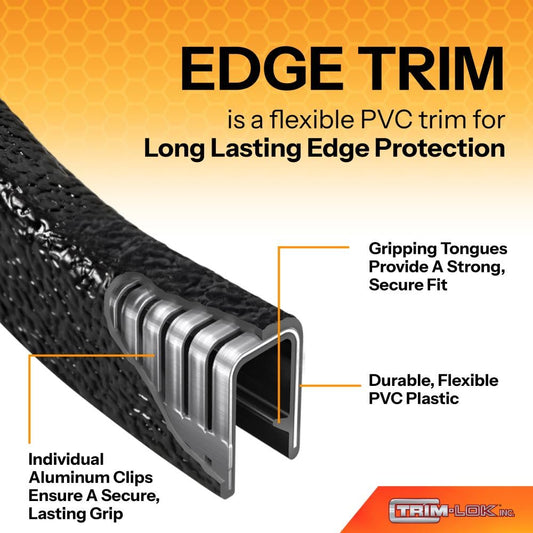 TRIM-LOK Edge Trim - Fits 3/32" Edge, 7/16” Leg Length, 25’ Length - Dual Gripping Fingers - Black, Pebble Texture - Flexible PVC Edge Protector