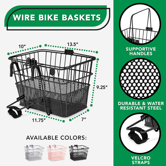 ProSource Wire Bike Basket Front for All Ages, Detachable Bicycle Front Basket with 15lbs Storage Capacity, Lightweight Steel Mesh Backing for Durable Daily Use, Black