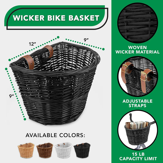 ProSource Wicker Bike Basket Front Cargo for Women and Men, Fits Most Bikes, Beach Cruiser, Stationary Bike, Ebike, Road Bike, Black