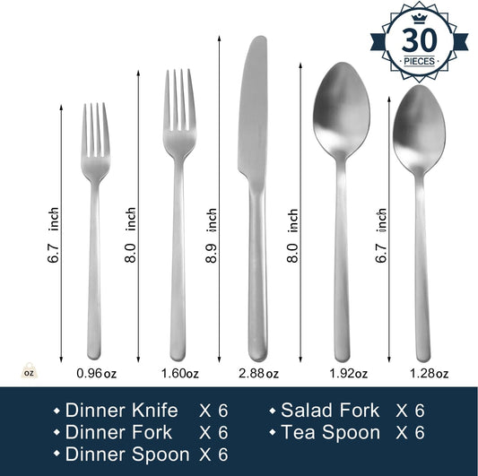 KINGSTONE 30 Pieces Silverware Set, Flatware Cutlery Set for 6, 18/10 Stainless Steel Silverware Utensils Minimalist Design Dishwasher Safe, Matte Silver