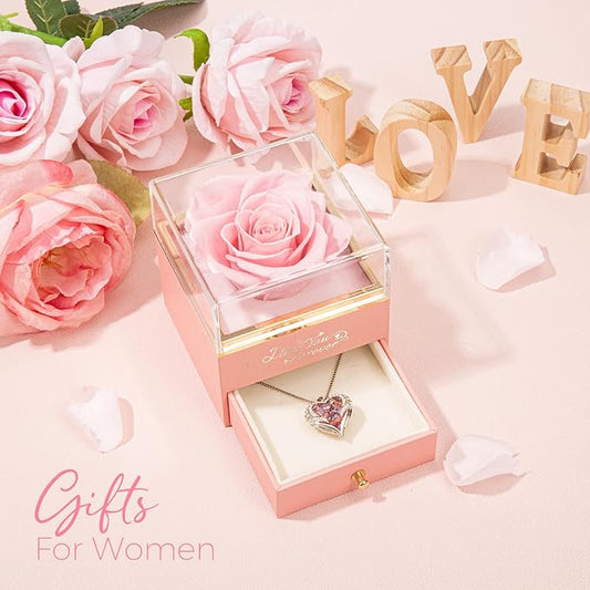 WILDLOVE Forever Real Rose with Heart Necklace, Preserved Flowers Gifts for Mom, Wife and Girlfriend on Christmas, Mother's Day, Birthday for Women