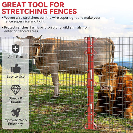 4ft Woven Wire Fence Stretcher Bar with 5 Wedges Heavy Duty Wire Stretcher Fence Tool for Farms, Ranches, Garden Barriers, Yard (Red)