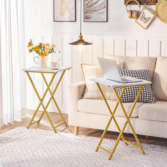 HOOBRO Folding TV Tray Tables, Set of 2 Wooden TV Tray, Portable Sofa Side Table, Industrial Snack Table End Table for Small Spaces, Space-Saving, Easy to Install and Fold, Marble and Gold DM27BZP201