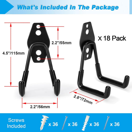 18 Pack Garage Hooks Heavy Duty - Supports 100 lbs, Utility Steel Garage Hanger & Organizer for Organizing Garden Lawn Tools, Ladders, Garden Hose, Digging Shovel, Bikes, Ropes