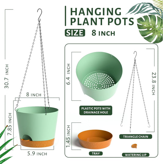 Hanging Planters for Indoor Outdoor Plants, 2 Pack Self Watering Hanging Pot with Drainage Holes and Plant Hangers, Hanging Baskets Flower Pots for Home Garden Decor (Green, 8 inch)
