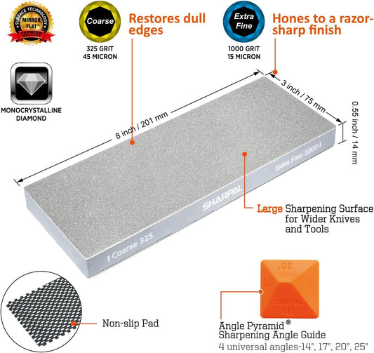 SHARPAL 168H Large 8" x 3" Dual-Grit Diamond Sharpening Stone – Coarse 325 & Extra-Fine 1000 Grit Monocrystalline Diamond Whetstone, Professional Knife Sharpener with Anti-Slip Pad and Angle Guide