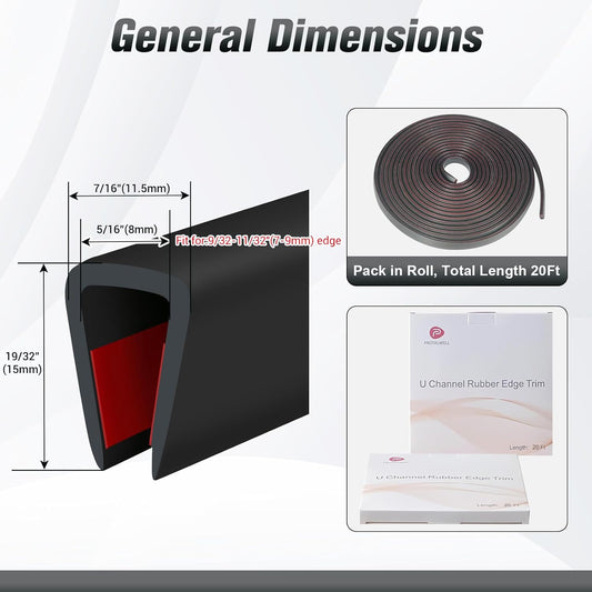 Rubber Edge Trim, 1/4" Self Adhesive Flexible U Channel Edge Protecter for Sheet Metal, Glass, Flexiglass and Plywood, Fit for 7/32"-9/32" Width Edge, Black Color, 20Ft, EPDM Material