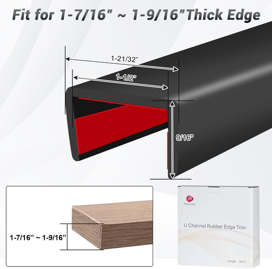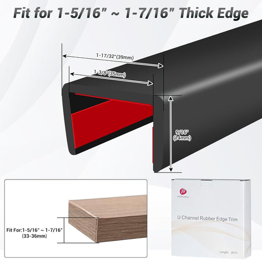 Rubber Edge Trim, 1-3/8 inch Wide U Channel Edge Trim, Big Size U Shaped Trim, Self Adhesive Edge Banding for Plywood, Woods, Doors, Shelf, Cabinet, Countertop, Length 20Ft, Black Gloss Finish