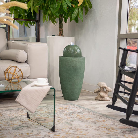XBrand 25.98" H Green Round Stone Indoor/Outdoor Modern Sphere Water Fountain w/LED Lights – Ball Bubbling Fountain Décor for Garden, Patio, or Tabletop