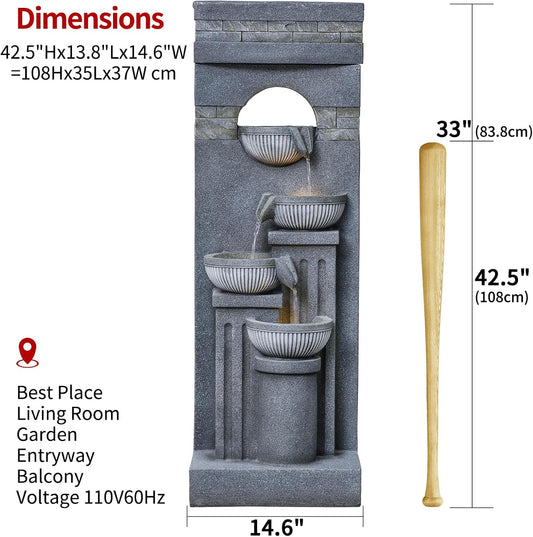 42.52" Outdoor Garden Water Fountain with Lights Floor-Standing 4 Tiers Cascading Large Waterfall Fountain for Patio, Backyard, Deck, Porch and Home Art Decor