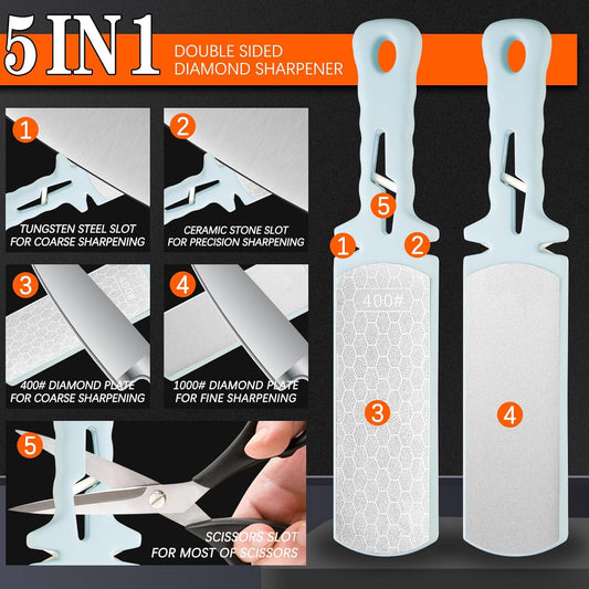 Diamond Sharpening Stone,400/1000 Grit Handheld Double-Sided Diamond Sharpener 5 in 1 Honeycomb Surface Knife Sharpener Plate Whetstone with Ceramic & Tungsten Steel Scissor Slot for Kitchen Outdoor