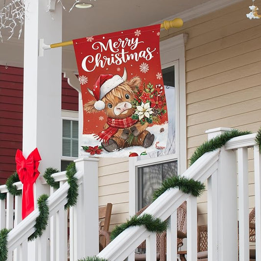 Heyfibro Merry Christmas Highland Cow Garden Flag 28x40 Inch Double Sided Burlap, Winter Snowflake Yard Flags for Holiday Xmas Seasonal Outdoor Decoration(ONLY FLAG)