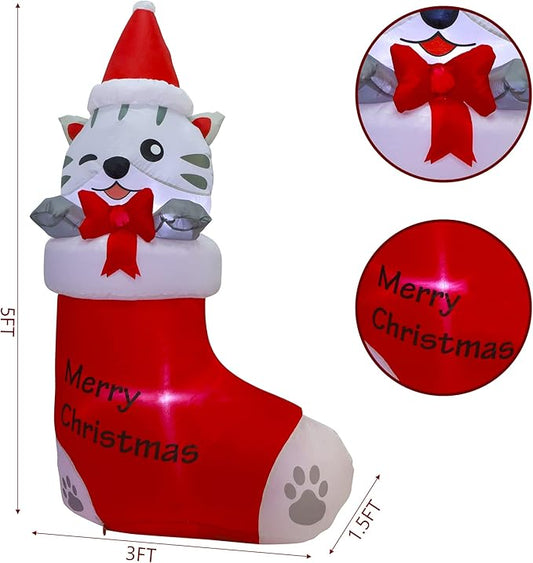 Juegoal 5 FT Christmas Inflatables Outdoor Decorations, Inflatable Kitten in Xmas Stocking, Lighted Blow Up Cat Standing on Christmas Socks with Built in Lights for Holiday Lawn Yard Garden Decor