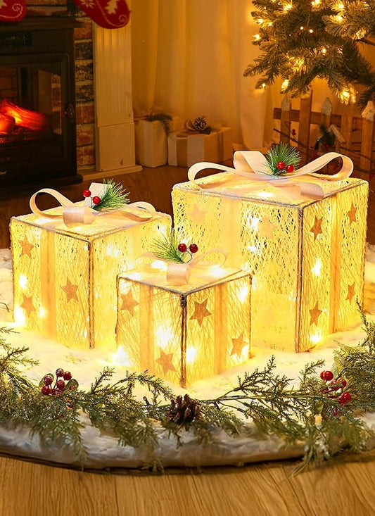 3 Pieces Lighted Gift Boxes Christmas Decorations, 12in 10in 8in with 60 Pre-Strung Mini String Lights, Foldable Light up Present Boxes for Indoor Outdoor Holiday Party Christmas Yard Home Art Decor