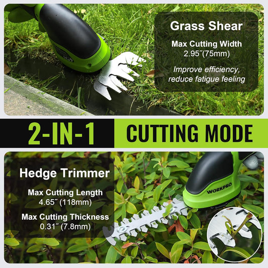 WORKPRO Cordless Grass Shear & Shrubbery Trimmer - 2 in 1 Handheld Hedge Trimmer 7.2V Electric Grass Trimmer Hedge Shears/Grass Cutter 2.0Ah Rechargeable Lithium-Ion Battery and USB Cable Included
