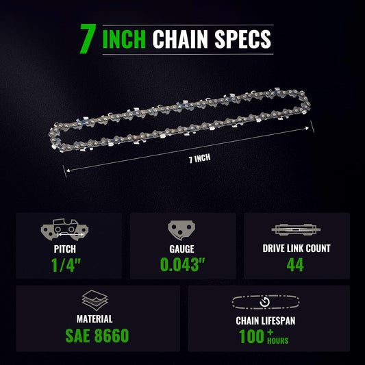 7" Chain Pitch: 1/4" Low Profile 44Drive Links Replacement Chain For 2-in-1 Cordless Pole Saw & Mini Chainsaw .043" Gauge