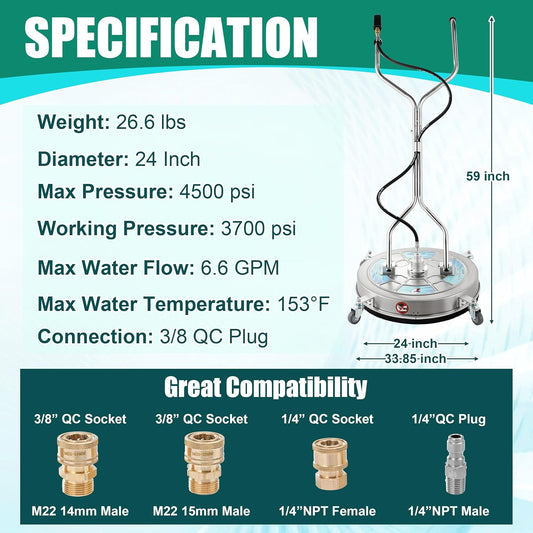 Tool Daily 24" Pressure Washer Surface Cleaner Attachment with Dual Handles, Stainless Steel Driveway Cleaner for Power Washer with Wheels, Pressure Wash Concrete, 4500 PSI